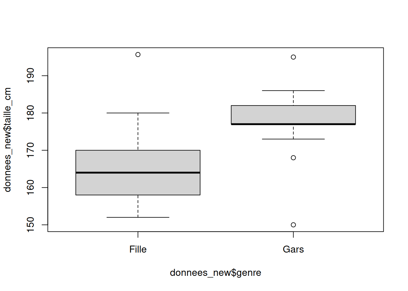 boxplot(donnees_new$taille_cm ~ donnees_new$genre)Commenter le code